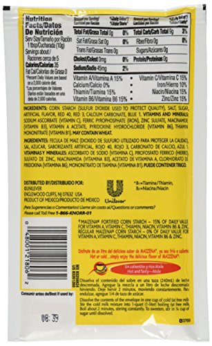 Fortified Corn Starch Bevarage Mix Atole Fortificado Flavored beverages you can serve everyday Just add to hot water or milk! Brand : Maizena EAN : 0048001218062