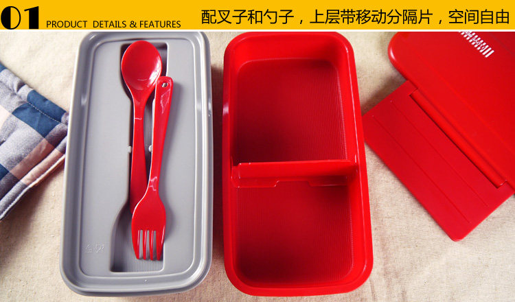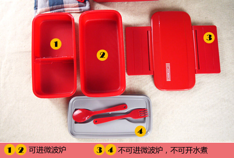 使用注意:微波加热时盖子和隔层(放叉子和勺子的那部分)不要进微波炉,也不可以用开水煮。刚烧好的菜勿立即装盒,不可以当保温饭盒使用。禁用铁丝球之类的搓洗。请注意开关盖的方法,不要单边单边打开或者关闭,可参考主图视频。