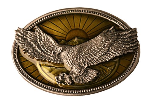 Materials: Handcrafted pewter and color fill for color. Detailing: An eagle placed over the center of colorfill and a sunset background. The eagles wings are spread out to the edges of the buckle. Dimensions: Height: 2.25", Width: 3.25" Made in USA 0