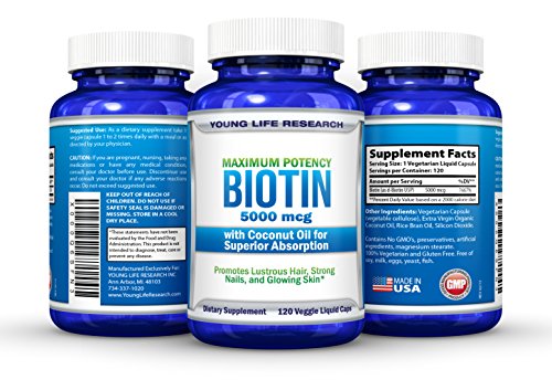 -. Feature : YOU WANT BIOTIN THAT WORKS - Unlike the others, we use only the finest high potency d-Biotin USP. One capsule gives you 5000 mcg of Biotin plus organic coconut oil for superior absorption. / 100% Vegetarian and Gluten Free and contains No GMO's, preservatives, artificial ingredients, magnesium stearate, soy, milk, eggs, yeast, or fish. It's made in the USA in a GMP certified facility. / There are lots of choices, but only Young Life Research stands out from the crowd. You get 120 liquid capsules per bottle! / 100% MONEY BACK GUARANTEE. If for any reason you're not completely satisfied, simply contact us and we'll give you a 100% refund. / PROVEN HEALTH BENEFITS - Hundreds of studies show Biotin Promotes Lustrous Hair, Strong Nails, and Glowing Skin. And it supports cellular energy production*. Try it out now and experience the Young Life Research difference!