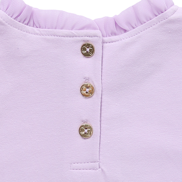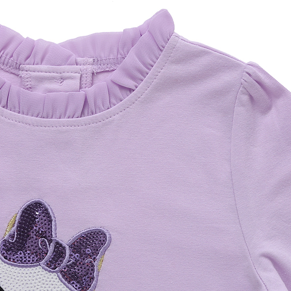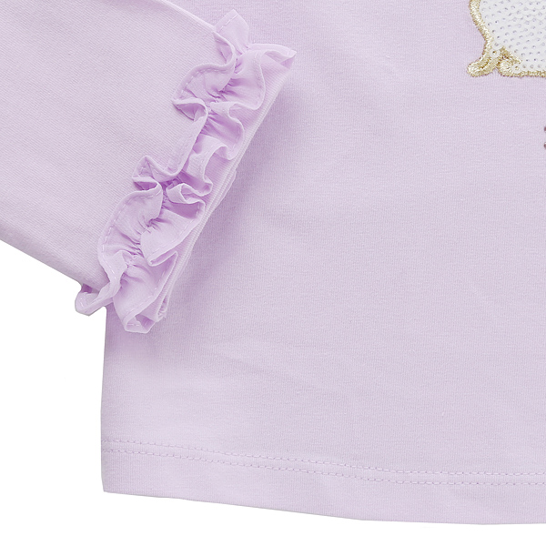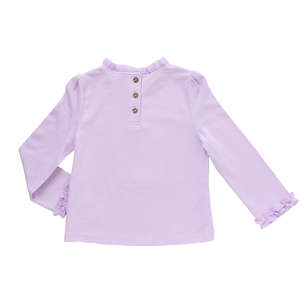 상품설명 연보라 프릴 티셔츠입니다. 네크라인과 소매밑단에 들어간 쉬폰프릴이 페미닌해 보이는데요 귀여운 리본달린 고양이 자수로 포인트를 준 아이템입니다.