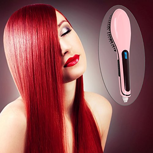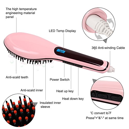 Feature : We combine a hair straightener with a brush. This digital hair straightener brush will replace your traditional flat iron straightener and at the same time will give you a head massage while straightening your hair. / We set our hair straightener brush with precise temperature to guarantee an ideal result without problem. The brush temperature will have a constant maximum temperature of 450℉ and we set a constant temperature at 365℉ for all types of hair but you can also customize it at 410℉ for natural texture hair and finally if you have thick and really wavy hair the setting is at 450℉ / If you do a moisturizing and hydrating of your hair and use some oil treatment you must set up the brush less than 125℉ and you will have the result you wish. / Our hair straightener has multifunction anti-static, anti-scald and anti-hair broken. Thanks to our straightener you will solve your hair knotting problem, reduce the pain and repair your broken hair and you will enjoy a head massage.