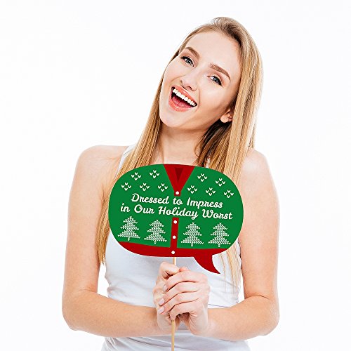 10-Piece Funny Ugly Sweater Photo Booth Props Kit INCLUDES 10 Christmas arrow and speech bubble photo booth props, 10 wooden dowel sticks and adhesives for assembly. EASY ASSEMBLY: Simply attach the printed DIY photo booth props to the wooden dowels with included adhesive and reinforcing stickers.