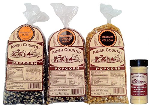 -. Title : Amish Country Popcorn 3 Bags 1 Pound Each, Midnight Blue, Rainbow, Medium Yellow Total 3 Pounds