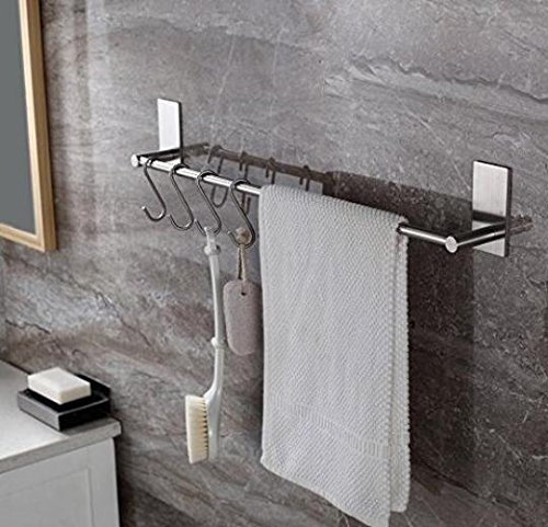 TOGU 27.5 inch Self Adhesive Single Towel Bar with 10 S Hooks, Heavy Duty SUS 304 Stainless Steel, Stick on Bathroom Lavatory with Square Base Hanging Towel, Brushed Stainless Steel Finish