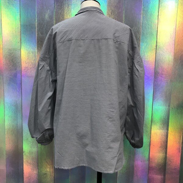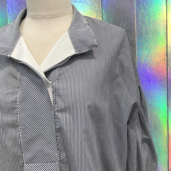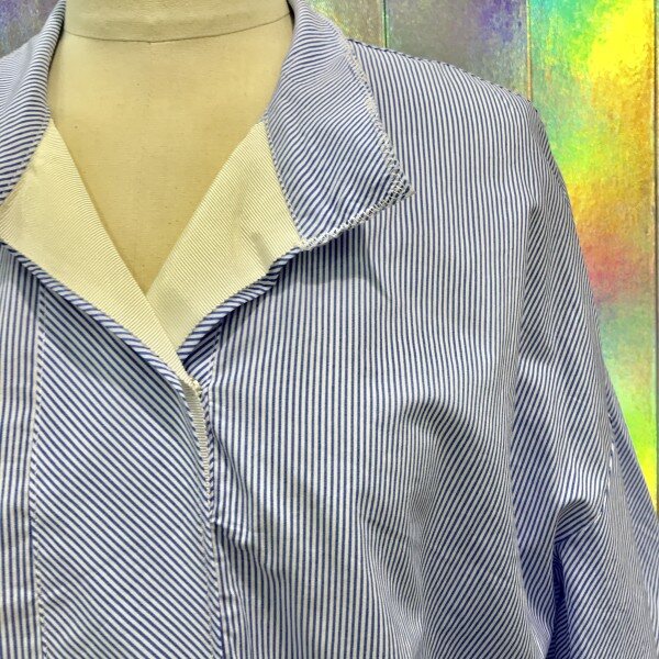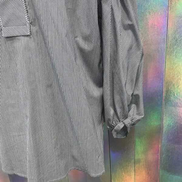 브이넥 카라배색과 벌룬소매가 매력적인흔치않은 디자인의 스트라이프 블라우스입니다