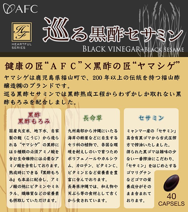 | 原材料名 | ゼラチン、黒酢もろみ末、大豆ペプチド、オリーブ油、サフラワー油、ごま油(セサミン含有)、ボタンボウフウ末(長命草)、黒酢、グリセリン、ミツロウ、着色料(カラメル) |