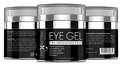 -. Feature : LUXE NATURAL PRODUCTS EYE GEL FOR IRRESISTIBLE EYES - The best anti-aging formula infused with all natural ingredients such as plant stem cells, Matrixyl 3000, and Hyaluronic Acid to address every eye concern. Reverse the signs of aging and recapture that youthful appearance. / RECAPTURE YOUTHFUL EYES - Hyaluronic Acid provides ultimate hydration and plumps sagging skin, Plant Stem Cells protect against sun damage & strengthen skin, and Matrixyl 3000 firms & smooths the skin surface. This trio of ingredients produces youthful, beautiful, radiant skin. / ALL NATURAL - Contains all natural ingredients with no harsh toxins, parabens, or chemicals. Our formula is safe for the even the most sensitive skin. / CUTTING EDGE TECHNOLOGY - Formulated with the most advanced natural ingredients on the market to produce irresistible eyes. / 100% SATISFACTION GUARENTEE - Try at no risk! If you are not completely satisfied with our product please contact us for a full refund.