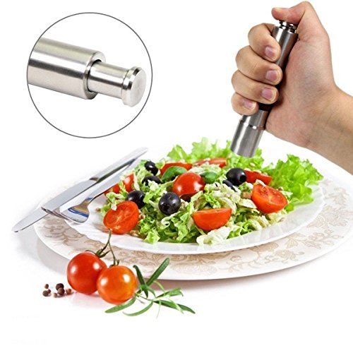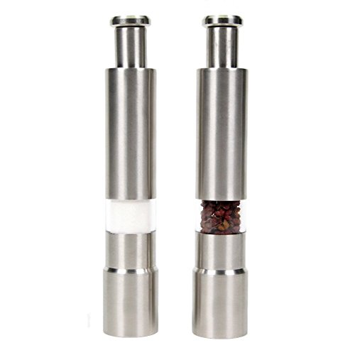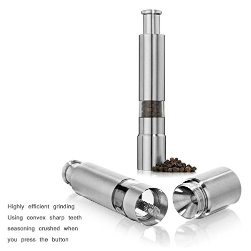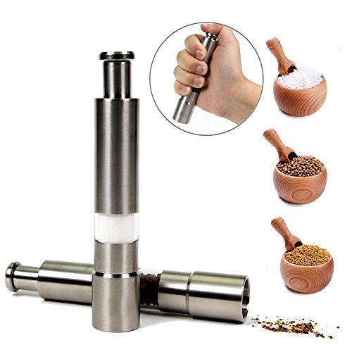 T&B Pepper and Salt Mills/Grinders 18/8 Stainless Steel Thumb Push Pepper Mills One-handed Operation Works with Peppercorns, Sea Salt, Himalayan Salt, Spices & Table Seasoning (2 Pack)