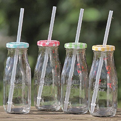 Studio : Whole House Worlds Publisher : Whole House Worlds Binding : Kitchen Product Description Serve your favorite drinks in our rustic Americana Heritage Home Milk Jar Drinking Cups. Sold as a set of 4, each each bottle style container is crafted of heavy duty glass that is dishwasher safe. Well sized, this country style drinking cup measures as follows: 2 ½ L x 2 ½ W x 6 ¼ H inches and holds 10 fluid ounces. Bright and cheerful gingham patterned tops of assorted colors (red, yellow, green and blue) feature a food-safe lid punctured with a hole to hold the reusable straw. AN IDEAL GIFT, it's perfect to celebrate holidays, birthdays, weddings and many more. So gorgeous, you'll want to keep it at home for yourself. Enjoy! By Whole House Worlds Welcome to the product line of Whole House Worlds. The New York based company offers high quality, stylish products for every room in the house, and beyond. From the kitchen, to the living room, to the bedroom, dining room, home office, closet and garden: Our criteria are comfort, quality, style and value. 0