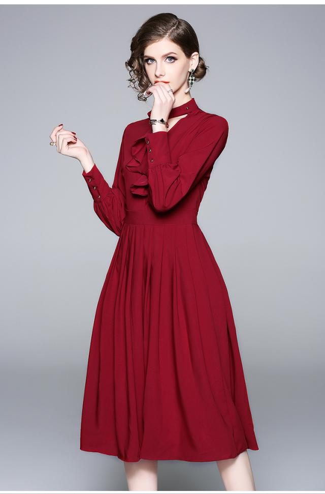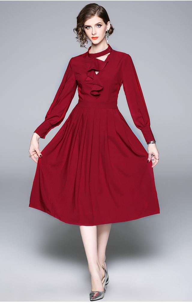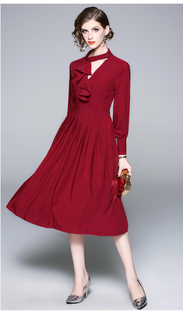 フリル ドレス ワンピース 長袖 フィットアントフレア パーティー 結婚式 二次会 女子会 謝恩会