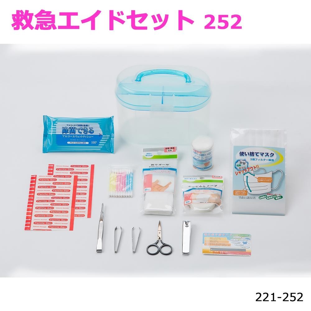 | セット内容 | 救急ケース、包帯、折りガーゼ10枚入、サージカルテープ、除菌ウエットティッシュ10枚入、爪切り、ハサミ、熱中症予防カード、毛抜き、先細毛抜き、綿棒10本入、絆創膏5枚入×2、マスク、ピンセット |