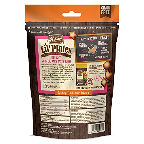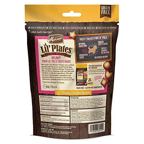 -. Binding : Misc. -. Brand : Merrick -. Label : Merrick Pet Care -. Manufacturer : Merrick Pet Care -. Model : 26050aaabbcddd-parent -. MPN : 26050aaabbcddd-parent -. PackageQuantity : 1 -. PartNumber : 26050aaabbcddd-parent -. ProductGroup : Pet Products -. ProductTypeName : PET_SUPPLIES -. Publisher : Merrick Pet Care -. Studio : Merrick Pet Care -. Title : Merrick Lil Plates Lil' Chunky Chicken Recipe Dog Treat, 5oz