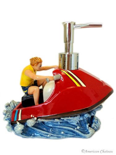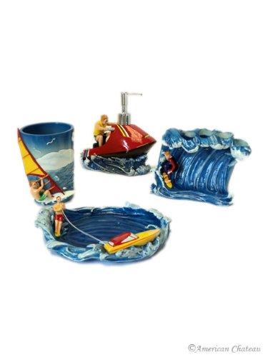 -. Feature : 4 PC Bathroom Accessory Set / Resin Construction / Includes: Soap Dish/Lotion Pump/Tumbler/Toothbrush Holder / Surf/Wind Surf/Water Skiing Design / Perfect for a Kid's Bathroom