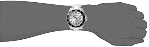 Polished and brushed finish black IP plated triple row link bracelet with fold over push button clasp Brushed finish stainless steel round shaped case with unidirectional ratcheting bezel Protective Krysterna crystal on front and decorated case back Silver radiant dial with applied markers and magnified date window at three o'clock position Water-resistant to 200 M (660 feet)Feature