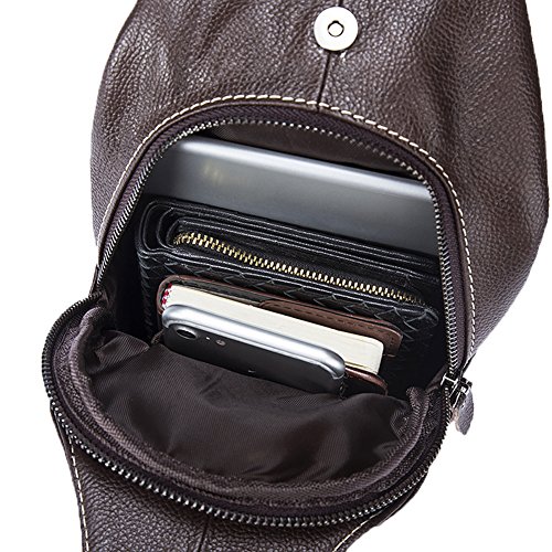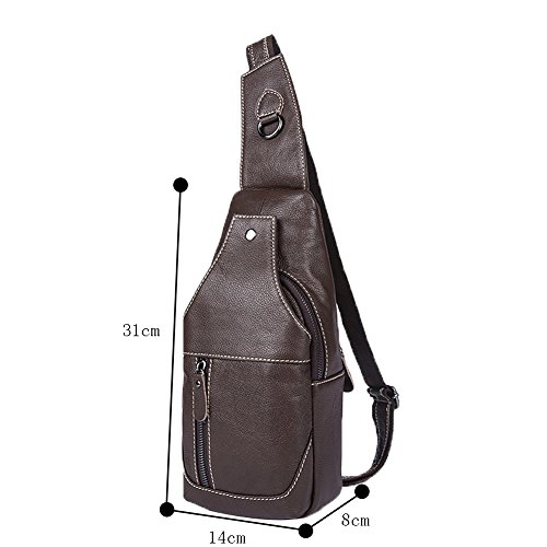 -. Feature : Material: 100% genuine leather / Size: 14cm(length)*8cm(thickness)*31cm(height) / 5.5*3.1*12.2 inch / Multipurpose backpack: chest pack/crossbody bag/shoulder bag/ unbalance sling bag / Structure: 1* Main zipper pocket + 1 * front small zipper pocket + 1 * back zipper pocket / Can hold your 8inch laptop, phone, Ipad, keys,wallet, umbrella, etc