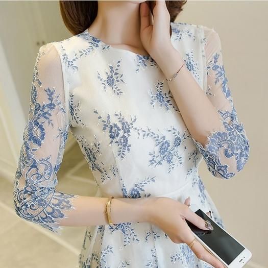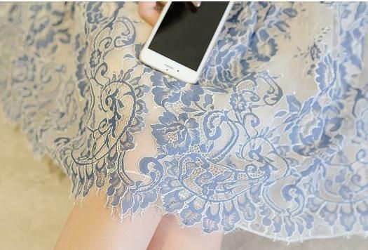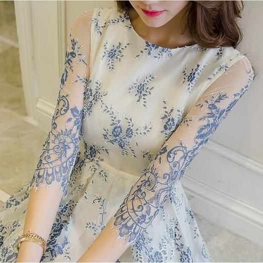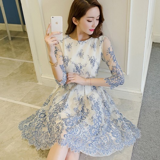 パーティードレス ひざ丈 ワンピース ブルー 花柄 レース 透け感 シースルー 大人 上品 可愛い お呼ばれ drgz2663