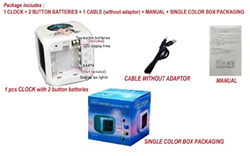 Power supply: Clocks display powered only by 2xAG13 batteries. LED light can be powered by 4xAAA batteries or by USB cable from any device, or by USB cable with power adapter from DC. Unfortunately batteries, USB cable and power adapter are not supplied by manufacturer. So as BONUS we are sending: 2xAG13 batteries and USB cable. We can't send 4xAAA batteries because of custom checks and power adapter because it can't be fit it in original box.