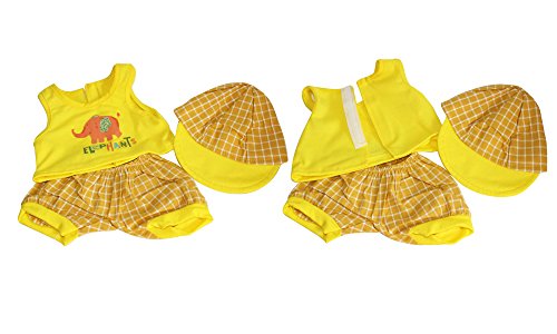 8 pieces includes: 2 long dresses(red and dark blue), 2 hats(casual yellow hat and cute rabbit ear pink hat), 1 short pink dot dress, 1 yellow T-shirt, 1 yellow shorts, 1 pink one-piece swimsuit