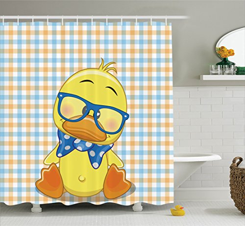 Cartoon Decor Shower Curtain Set By Ambesonne, Hipster Boho Baby Duck With Dotted Bow Cool Free Spirit Smart Geese Artsy Decor, Bathroom Accessories, 69W X 70L Inches, Orange Yellow Blue