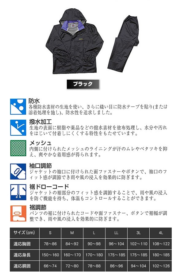 総裏メッシュで活躍の場を選ばないオールマインドな性能のレインスーツ!雨の浸入を防ぐ、数々の機能的デザインを搭載。