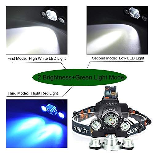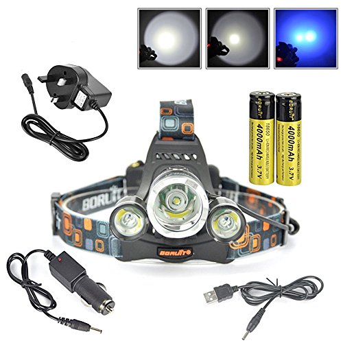 5000 LUMENS - Equipped with XML-T6 LED White Light as the main beam, with two side XR-E R2 Blue Lights this headlamp offers you maximum brightness for outdoor and night activities, including camping, hiking, riding, hunting and fishing