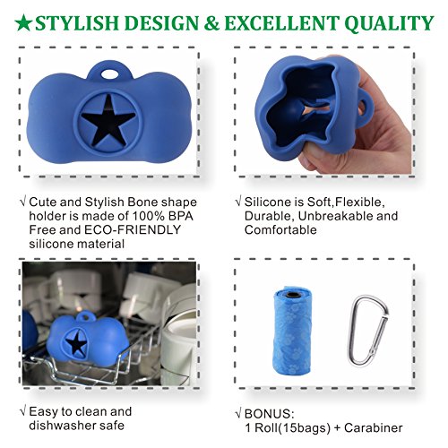 √ FDA approved 100% Food Grade, BPA Lead Free Silicone for the whole family √ Polyethylene and high quality bags are biodegradable √ Easy to carry. Put bags into dispenser from the bone shape opening, and extract bags from the star shape opening √ Easy to clean and Top rack dishwasher safe √ Excellent strength and stability.