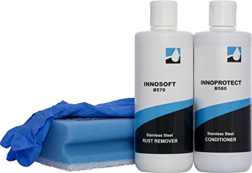 -. Brand : EliminateRust -. Feature : POLISH STAINLESS STEEL: Erase smudges, marks, dirt & grease from appliances stoves refrigerators sinks & grills / RUST ERASER & PROTECTANT: Our organic soft cleaner removes rust & our conditioner prevents rusting / 100% ORGANIC: Natural, safe & suitable for food industry appliances / machinery or your home kitchen / INCLUDED GLOVES & SPONGE: So you have everything you need to start cleaning when your package comes / CUSTOMER SATISFACTION: If you are not satisfied with our product, return it for a full refund -. Label : EliminateRust -. Manufacturer : EliminateRust -. ProductGroup : Kitchen -. ProductTypeName : KITCHEN -. Publisher : EliminateRust -. Studio : EliminateRust -. Title : Organic Stainless Steel Cleaner & Rust Remover Kit: InnoSoft B570 & B580 (3.38oz ea.) EliminateRust