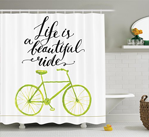 Bicycle Decor Shower Curtain Set By Ambesonne, "Life Is A Beautiful Bike Ride" Quote Print With Pastel Color Unique Bike Graphic Work, Bathroom Accessories, 69W X 70L Inches, Green Black
