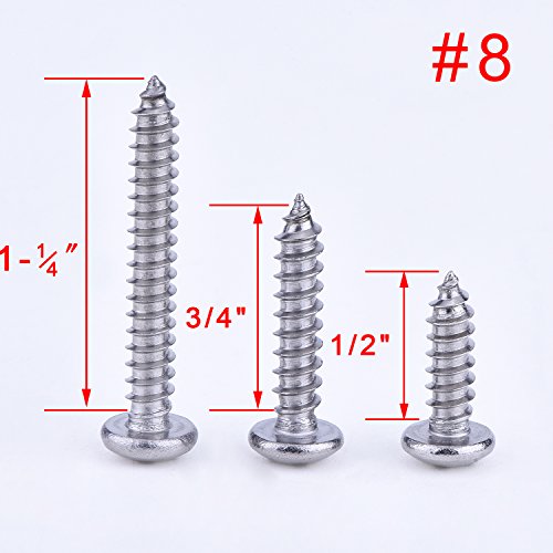 - Pan head wood screws: 3 sizes of the screws are #8 x 1/ 2 inch, #8 x 3/ 4 inch, #8 x 1 1/4 inch (50 pieces each size), with cross slot and pan head, 150 pieces in total