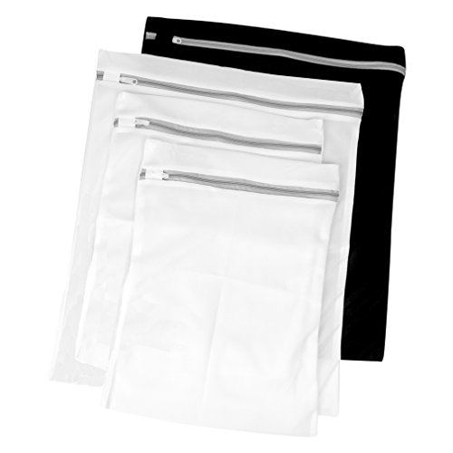 These bags are also designed with convenient zipper guards to tuck the zippers underneath to protect & ensure a quiet, snag-free wash. Comes with a total of 4 delicates laundry bags: 1 large black, 1 large white, and 2 medium white bags.