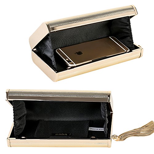 Product Description Body material: metallic PU Metal finishing: light gold Lining: black grosgrain The weight with packing is around 0.3LB Please allow little color difference due to different camera or light environment Little smell is normal, putting it outside for few days, the smell will disappear Please confirm the size according to our description instead of the product image,size may be about 1 Inch in accuracy due to hand measure 0