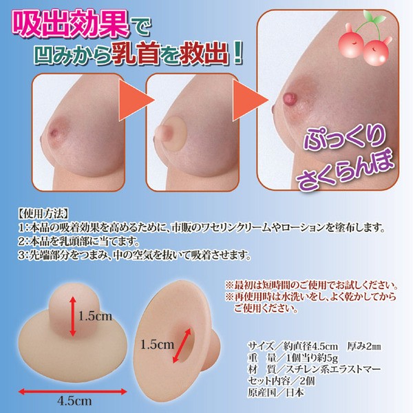 【商品名】 乳首吸引器/チェリートップ3 【2個入り】 厚み2mm (プラセンタ配合/抗菌加工) 【ジャンル・特徴】 授乳の悩み…陥没乳首等、バストトップのお悩みに。乳頭吸引器 陥没乳首、授乳の悩みなど・・・、凹んだ乳首でお悩みの女性に、寝ている間に集中ケアをオススメ。吸出効果でキュっとバストトップを吸引することで、正常な位置に戻し、凹みを解消します。コンパクト設計だから、就寝中や外出時のブラジャーの下でも装着できます。水洗いできるので、いつでも清潔に使えるのも嬉しいポイントです。【ご使用方法】本品の吸着効果を高めるために、市販のワセリンのクリームやローションを塗布してください。本品を乳頭部にあてます。先端部をつまみ、中の空気を抜いて、吸着させます。※最初は短時間のご使用でお試しください。※再使用時は水洗いし、よく乾かしてからご使用ください。■商品スペック【商品名】チェリートップ3 【サイズ】約直径4.5×高さ1.5cm 厚み2mm 【重量】約5g 【材質】スチレン系エラストマー 【セット内容】2個 【生産国】日本 【特記事項】 【注意事項】
