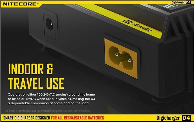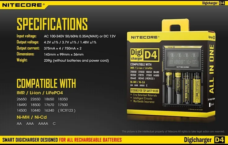 The Nitecore D4 is a universal smart charger compatible with almost all cylindrical rechargeable batteries, thus eliminating the need to own several chargers. The D4 automatically detects Li-ion, Ni-MH and Ni-Cd batteries, and through manual selection is also capable of charging LiFePO4 batteries. Intelligent charging circuitry selects the optimal charging mode (CC, CV and dV/dt) for a given battery and each of the D4s four microcomputer-controlled charging slots then monitors and charges the battery independently. Furthermore, an integrated digital LCD screen clearly displays charging progress, voltage, current and time while an intelligent automatic power-off function terminates current when charging is complete. The Nitecore D4: The worlds most advanced fully-automatic digital charger. Its as simple as insert, detect and charge.