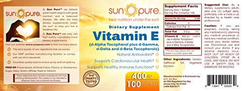 -. Binding : Health and Beauty -. Brand : Sun Pure -. EAN : 0813947029269 -. Feature : Fight against cell damaging free radicals with antioxidants in vitamin E / These vitamin E capsules gives you the antioxidants you need to benefit all different aspects of your body / These are the best vitamin E supplements for detoxifying the body and helping support your immune system / These vitamin E 400 softgels are tested in third party labs to ensure safety and potency / At Sun Pure we believe that great health begins with great nutrition and a balanced lifestyle. We offer the best dietary supplements 'under the sun!' to help you live a healthier life. All Sun Pure products are manufactured in USA at a GMP certified facility to ensure quality and full potency. -. IsAdultProduct : 0 -. Label : Sun Pure -. Manufacturer : Sun Pure -. MPN : 29269 -. PackageQuantity : 1 -. PartNumber : 29269 -. ProductGroup : Health and Beauty -. ProductTypeName : HEALTH_PERSONAL_CARE -. Publisher : Sun Pure -. Studio : Sun Pure -. Title : Sun Pure Premium Quality Vitamin E (Mixed Tocopherols) 400 IU 100 Softgels Glass Bottle *Supports Cardiovascular health *Supports Healthy Immune Function -. UPC : 813947029269