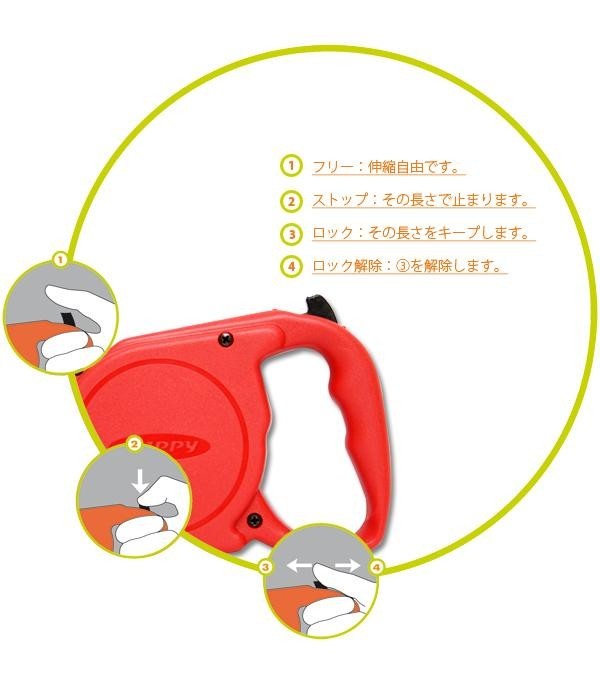 | イタリアferplast社製、伸縮リードシリーズの中でも最もベーシックなリードです。「フリー」「ストップ」「ロック」「ロック解除」の操作が1つのボタンで片手で簡単にできます。ヒモの長さは5mなので、広い場所でものびのび走らせられます♪ |