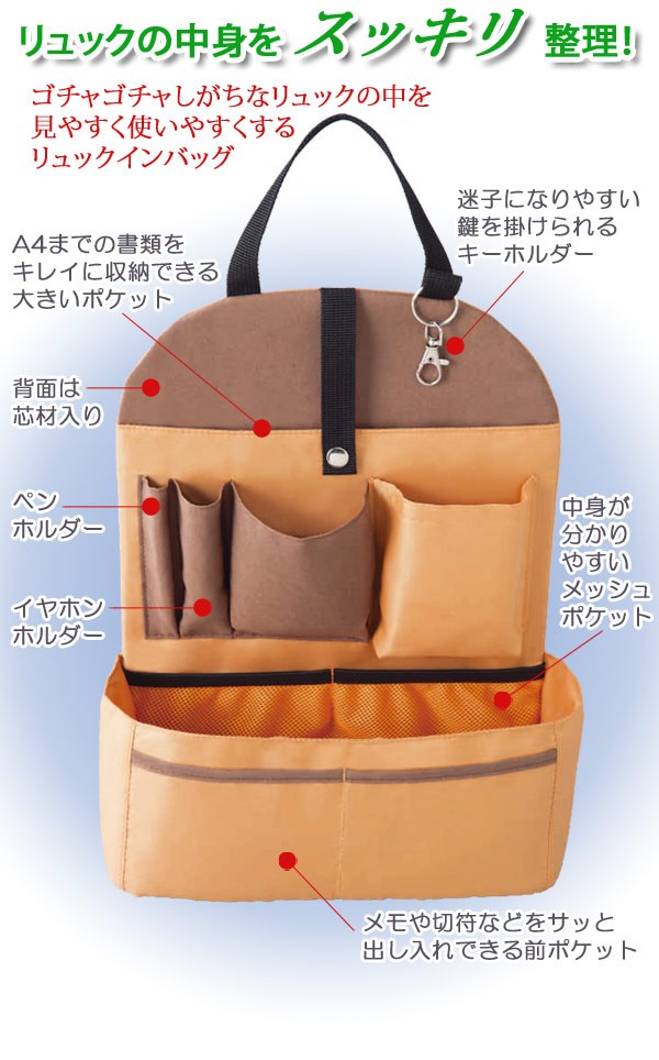 | ゴチャゴチャしがちなリュックの中身をスッキリ整理できるリュックインバッグ!スマホやお財布、イヤホンや切符などを定位置に収納できてすぐに取り出せます。A4サイズの書類が入る大きいポケット・ペンを収納できる専用ホルダー・鍵が掛けられるキーホルダーもついて便利!暗いリュックの中でも見やすい、茶系の明るめカラーです。リュックの縦のスペースを有効活用して使いやすく♪ |