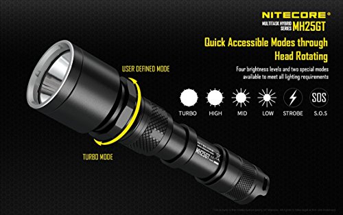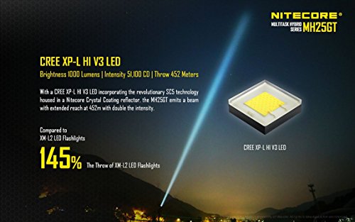 MAJOR UPGRADE FROM Nitecore MH25 - Produces a max output of 1000 lumens with a brighter and more focused beam powered by a the premium CREE XP-L HI V3 LED. It also offers a longer runtime with an included high capacity 3400mAh 18650 rechargeable battery.