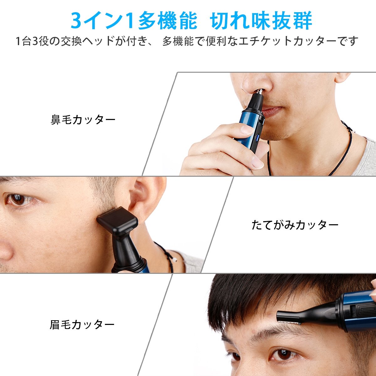 This product is a nose hair cutter, eyebrow cutter, mane cutter, battery type nose hair cutter with three functions.