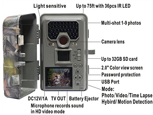 3. Capture mode: PIR Camera or Video, Camera+Video, Time Lapse, Motion detection; Password protected; 1-60 minutes picture delay, user friendly interface, 40000 images on 8pcs AA batteries(not included)