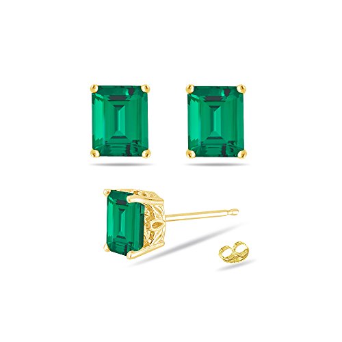 Timeless studs for any special occasion. The studs have the finest AAA quality emerald-cut Russian Lab Created Emerald prong set in 14K Yellow Gold. Lab created gemstones are developed in the lab creating the same pressure and temperature, these stones have the same chemical, physical, and optical properties as natural gemstones. The delicate scroll design adds a beautiful feminine appeal to the classic studs.