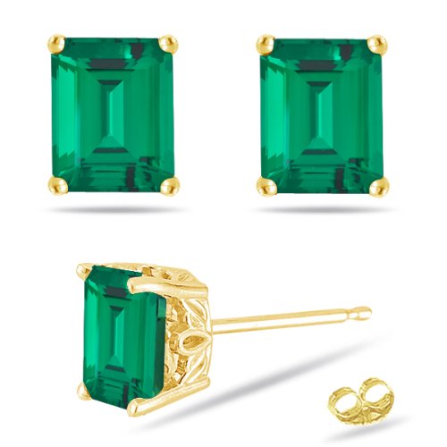 These extraordinary Lab Created Emerald Scroll Stud Earrings are accentuated with an AAA quality Emerald Emerald each prong set in 14K Yellow Gold . Approximate Gemstone Weight: 0.84-1.04 Carats. Wear these earrings to have the heads turn with awe.,METAL:14K Gold,ACTUAL METAL:14K Yellow Gold,BACKING:Push Backs,GEMSTONE:Lab Created Emerald,SHAPE:Emerald,AVERAGE COLOR:Medium-Dark Green,AVERAGE QUALITY:AAA,MINIMUM CARAT TOTAL WEIGHT:0.84-1.04,GEMSTONE DIMENSIONS:6x4 mm,SETTING STYLE:Prong Setting,NUMBER OF STONES:2,COLOR:Green,STYLE:Scroll,ORIGIN:Unknown,MINDIMENSION:4.00 mm,MAXDIMENSION:6.00 mm,PRODUCT TYPE:Lab Created Emerald Scroll Stud Earrings,GENDER:Womens,MATERIAL:Gemstone,STONE CREATION METHOD:Synthetic,TREATMENT METHOD:NAFeature