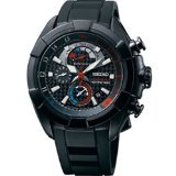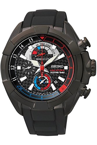 Black ion-plated stainless steel case with a black rubber strap. Fixed black ion-plated bezel. Black dial with luminous hands and index hour markers. Minute markers. Dial Type: Analog. Date display between 4 and 5 o'clock positions. Quartz movement. Scratch resistant Hardlex crystal. Solid case back. Case diameter: 48 mm. Case thickness: 11 mm. Round case shape. Band width: 22 mm. Deployment with push button clasp. Water resistant at 100 meters / 330 feet. Functions: chronograph, date, hour, minute, second, alarm. Sport watch style. Watch label: Japan Movt. Seiko Velatura Yachting Timer Black Dial Black Rubber Mens Watch SPC149.Feature