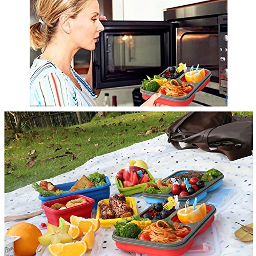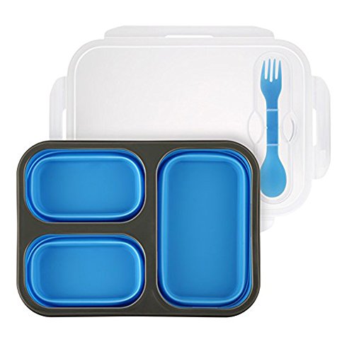 COMPACT AND PORTABLE DESIGN---Collapsible 3-compartment design 600ML ,easy to carry and save space;with a convenient 2-in-1 fork in the lid.Include 3 compartments - great for fruit, lunch and snacks.