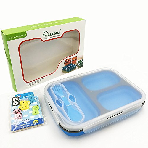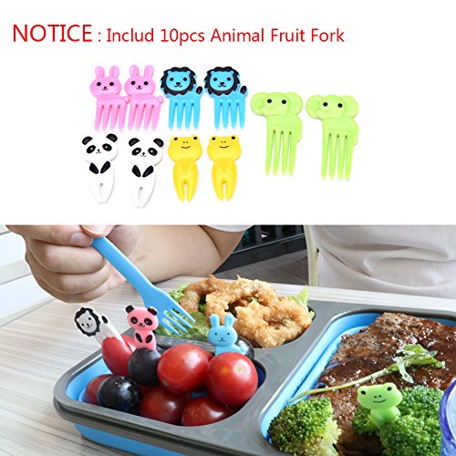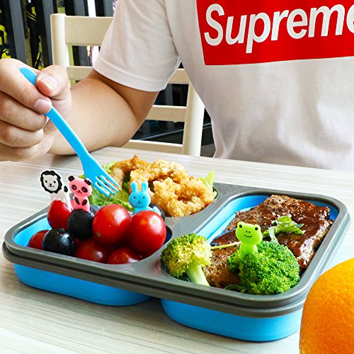 Collapsible 3-Compartments Bento Lunch Box,Leakproof Silicone Lunch compartment container with Spork for Adults, Kids(Include with 10pcs Animal Fruit Fork)(blue)