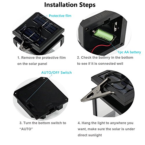 -. Feature : 🌟Small & Portable - 3.5" x 3.5" x 4.9", with a metal clamp and ring, easy to hang the lights to anywhere you want. / 🌼Auto Sensor - slide the bottom switch to "AUTO", the light will automatically charge itself during the day and light up at night / 🎄Soft Candle Flicker Effect - it is magical to see the light flickering like a candle at night, creating a nice and romantic ambiance. / 🌹Weatherproof IP44 - suitable for outdoor use, great to decorate your garden, patio, walkway, fence, backyard etc. / 💥100% Satisfaction Guarantee - with 12-months quality assurance service, message us and we will send you new lights or refund you to make you satisfied.