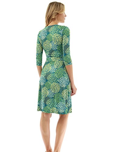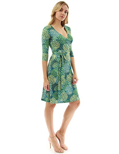 PattyBoutik Print V Neck Faux Wrap 3/4 Elbow Sleeve Tie Belt A Line Dress. Model in pictures is 5 feet 8-10 inches (173-178cm) tall wearing size S.