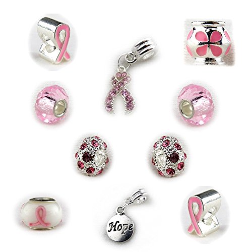 Set of 10 Cancer Awareness Pink Ribbon Charms and Beads