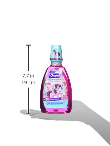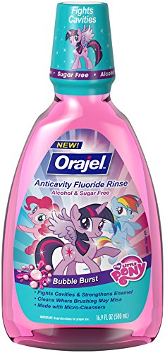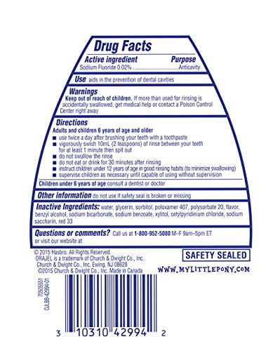 -. Binding : Health and Beauty -. Brand : Orajel -. EAN : 0310310429942 -. Feature : Orajel's Anticavity Fluoride Rinse strengthens and protects developing teeth / Micro cleaners help to clean where brushing may miss for healthy teeth and gums / Unique Alcohol-free & sugar free formula with a great Sparkle Burst flavor that kids love / My Little Ponies Pinkie Pie, Rainbow Dash and Twilight Sparkle make brushing fun and when brushing is fun it gets done / From Teething to Training to Brushing, Orajel is there for kids and parents -. Label : Church & Dwight - Personal Care -. Manufacturer : Church & Dwight - Personal Care -. MPN : 31031042994 -. NumberOfItems : 1 -. PackageQuantity : 1 -. PartNumber : 31031042994 -. ProductGroup : Beauty -. ProductTypeName : BEAUTY -. PublicationDate : 2016-01-23 -. Publisher : Church & Dwight - Personal Care -. ReleaseDate : 2016-01-20 -. Studio : Church & Dwight - Personal Care -. Title : Orajel My Little Pony Anticavity Fluoride Rinse, Sparkle Burst, 16.9 Oz -. UPC : 310310429942