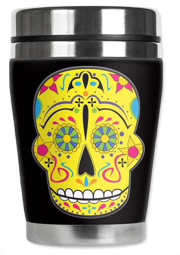 Mugzie Yellow Sugar Skull "Mini" Travel Mug with Insulated Wetsuit Cover, 12 oz, Black